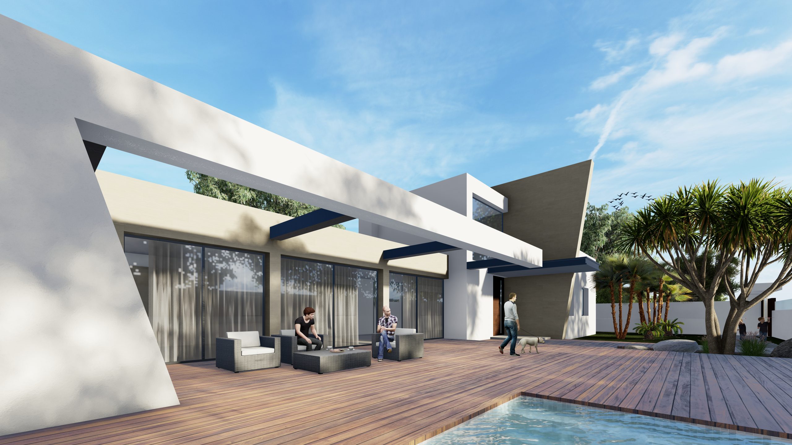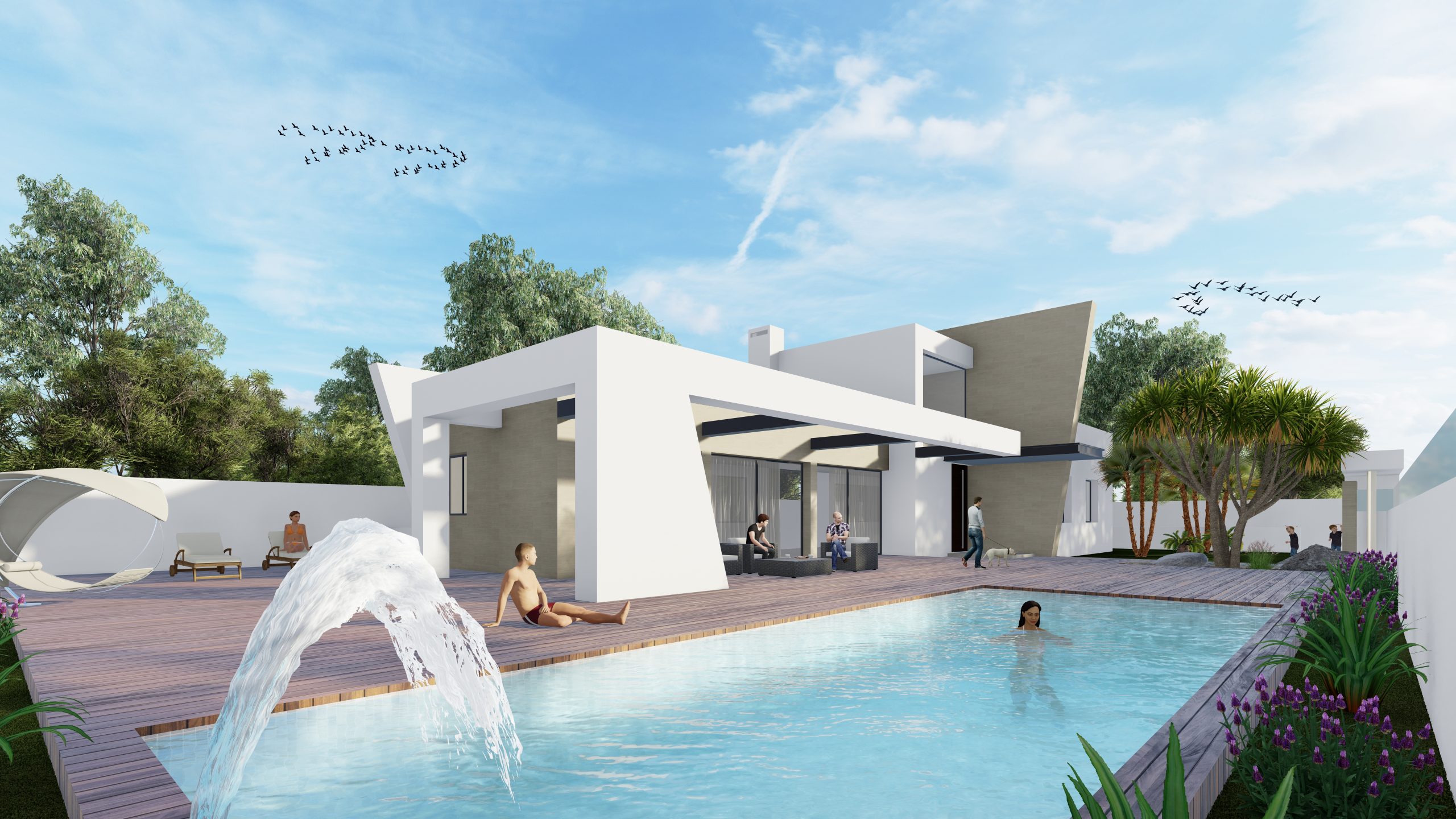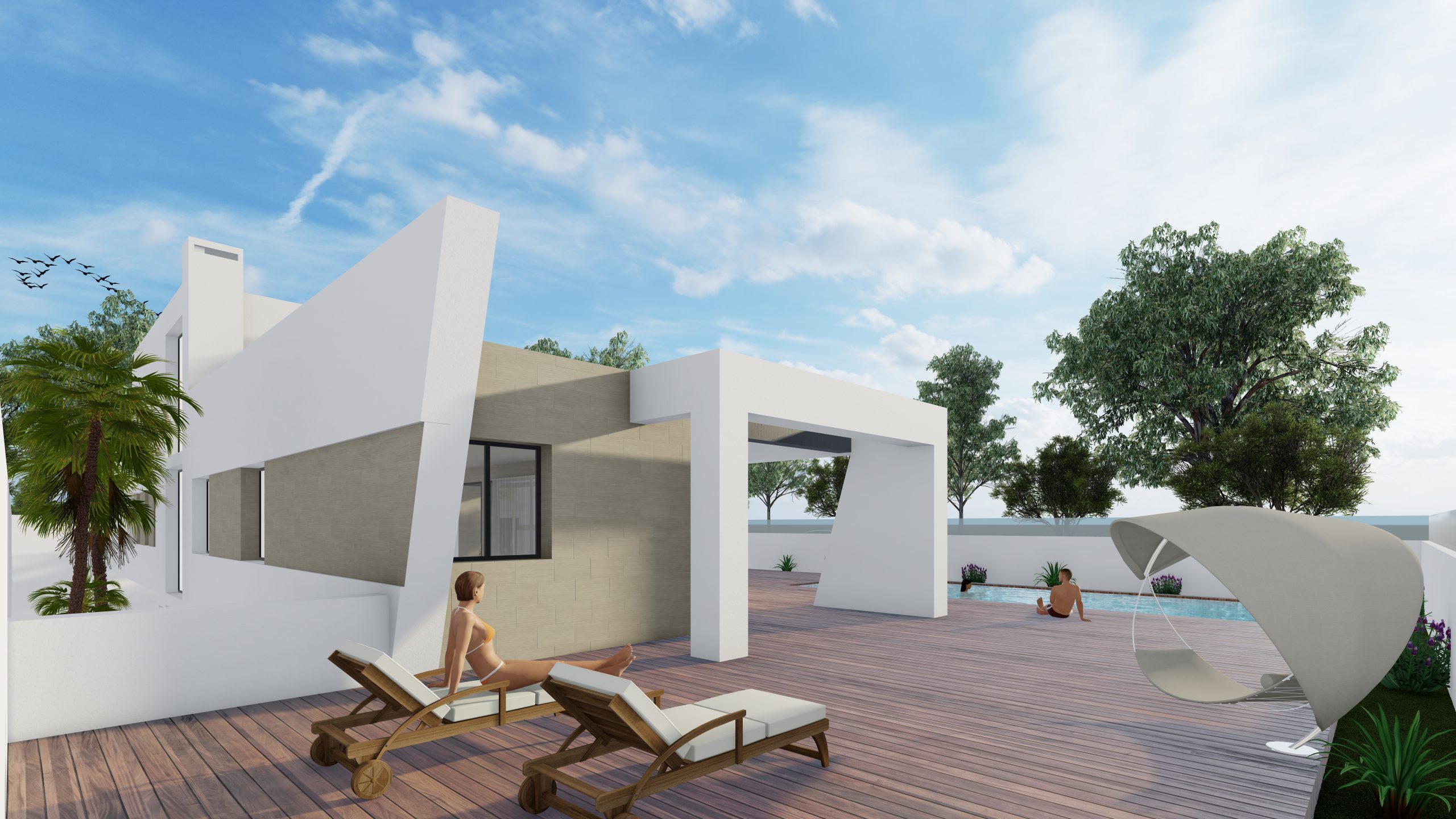 El espacio exterior de la parcela se organiza en torno a una piscina, una zona de porche y amplias áreas de uso y disfrute, proyectadas para sacar el máximo partido a la excelente orientación sur de la vivienda, permitiendo disfrutar del sol y del clima durante todo el año.