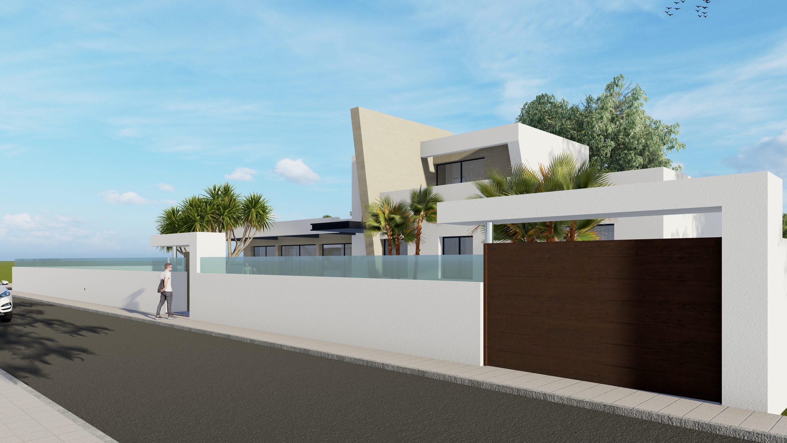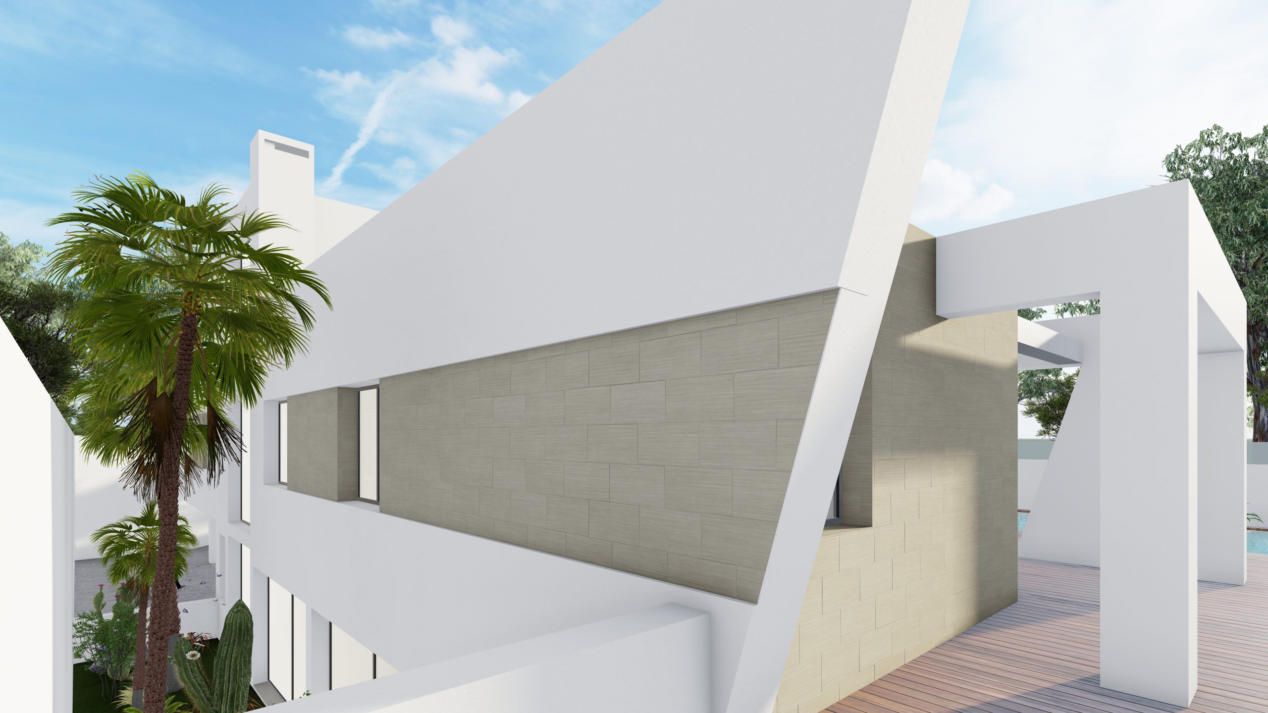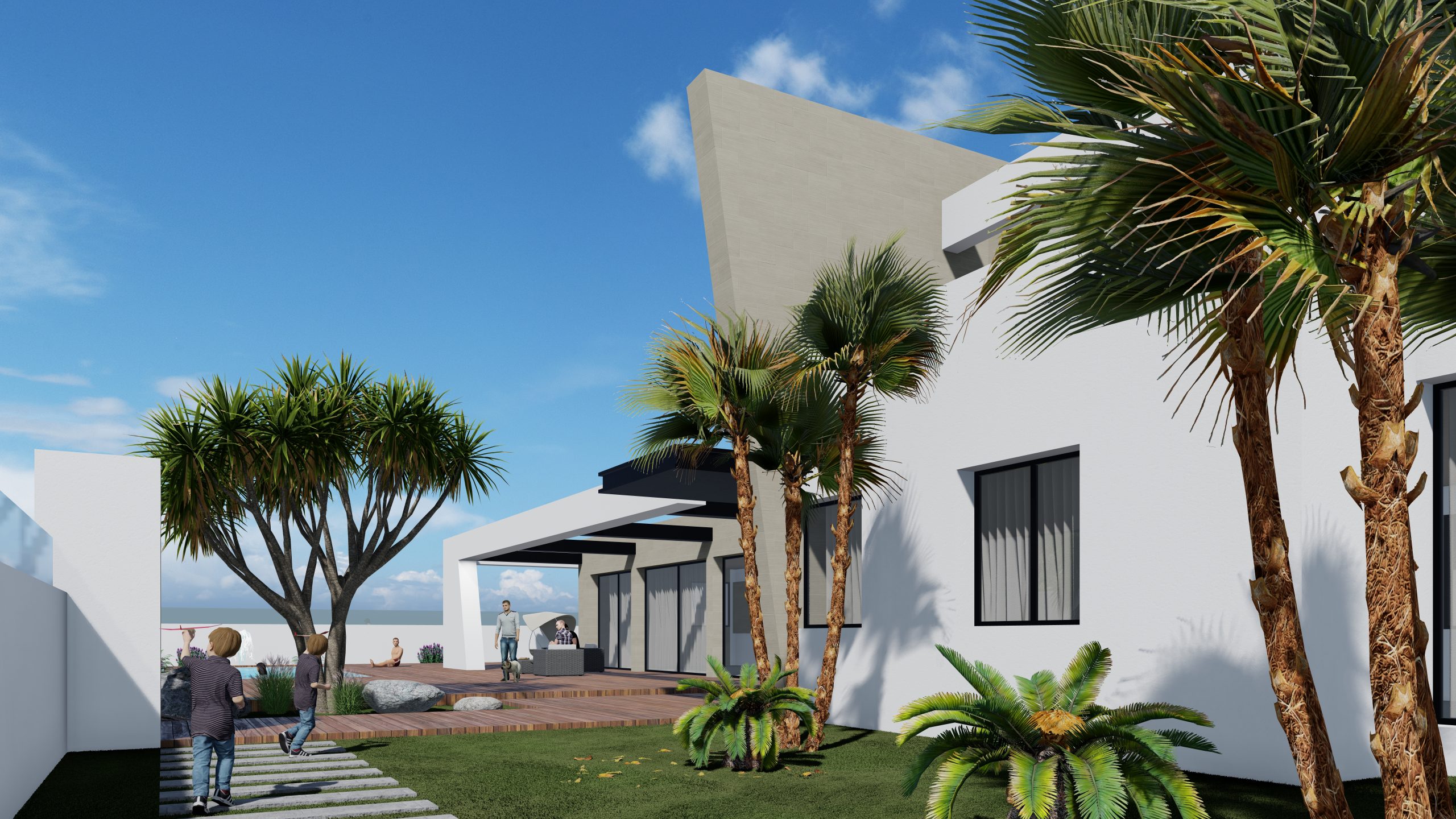 El espacio exterior de la parcela se organiza en torno a una piscina, una zona de porche y amplias áreas de uso y disfrute, proyectadas para sacar el máximo partido a la excelente orientación sur de la vivienda, permitiendo disfrutar del sol y del clima durante todo el año.