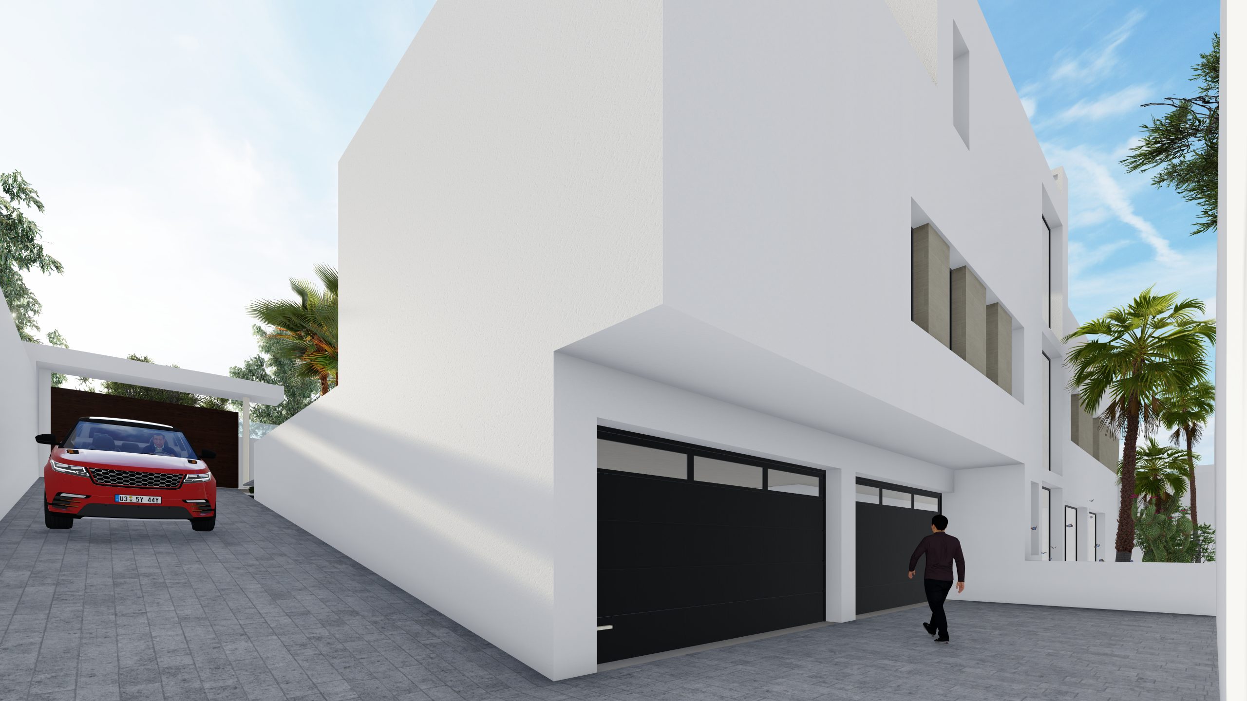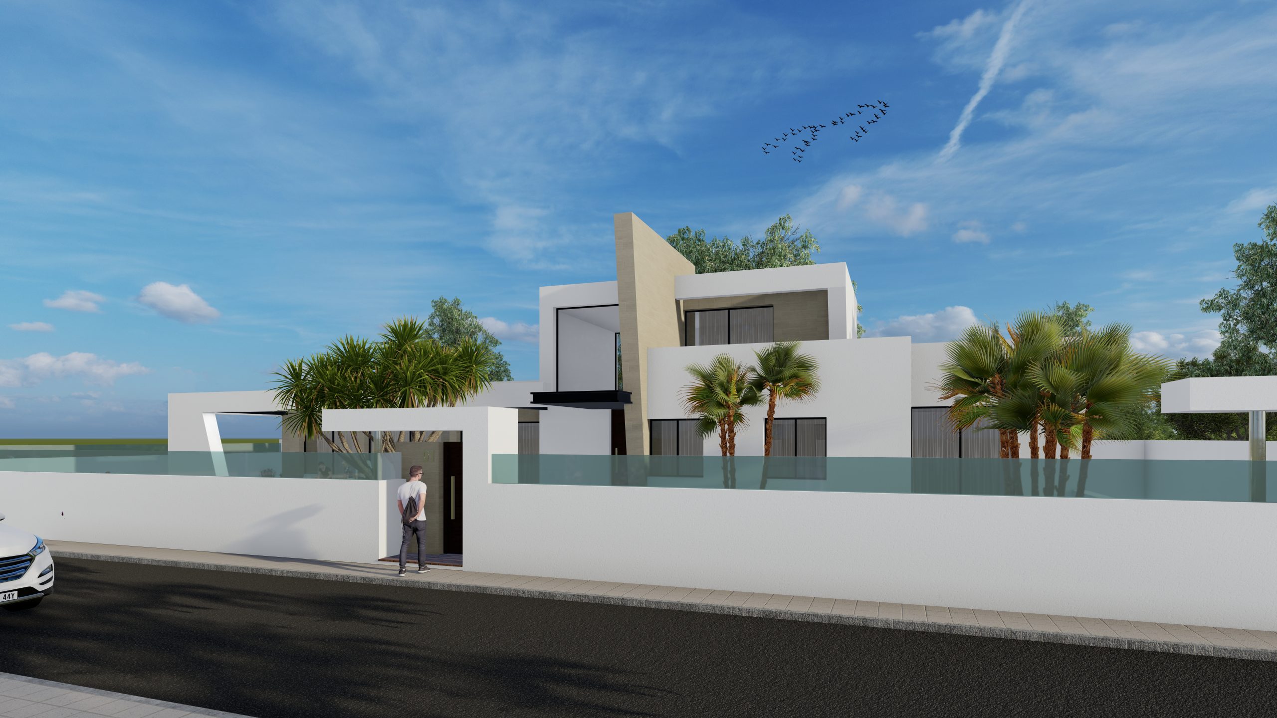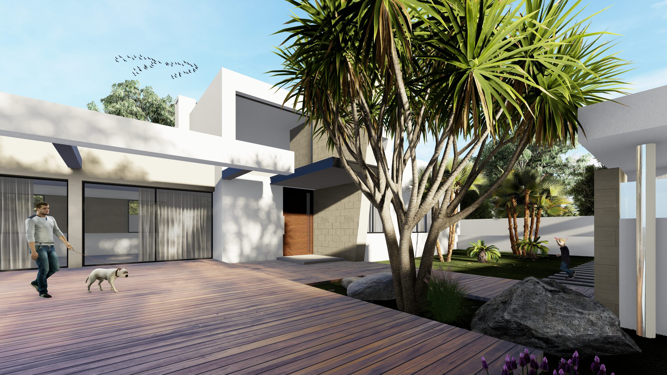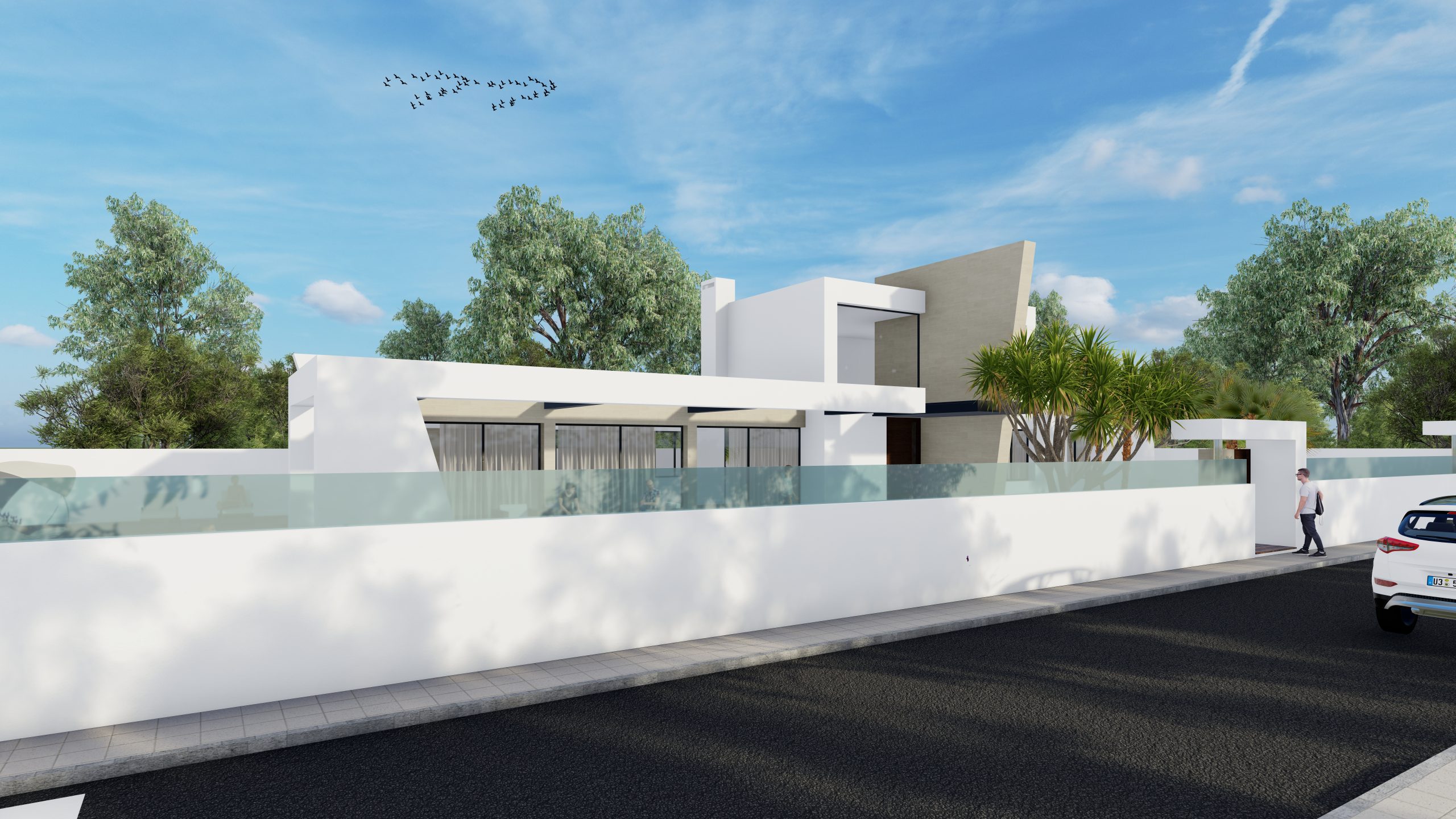 Al acceder a la vivienda, un recibidor de doble altura actúa como núcleo articulador del proyecto, presidido por una escalera escultural que comunica las distintas plantas. En la planta principal se distinguen claramente la zona de día y la zona de noche. La primera se compone de un amplio salón-comedor y una cocina abierta, ambas conectadas visual y físicamente con el jardín y la piscina a través de grandes ventanales que inundan los espacios de luz natural.