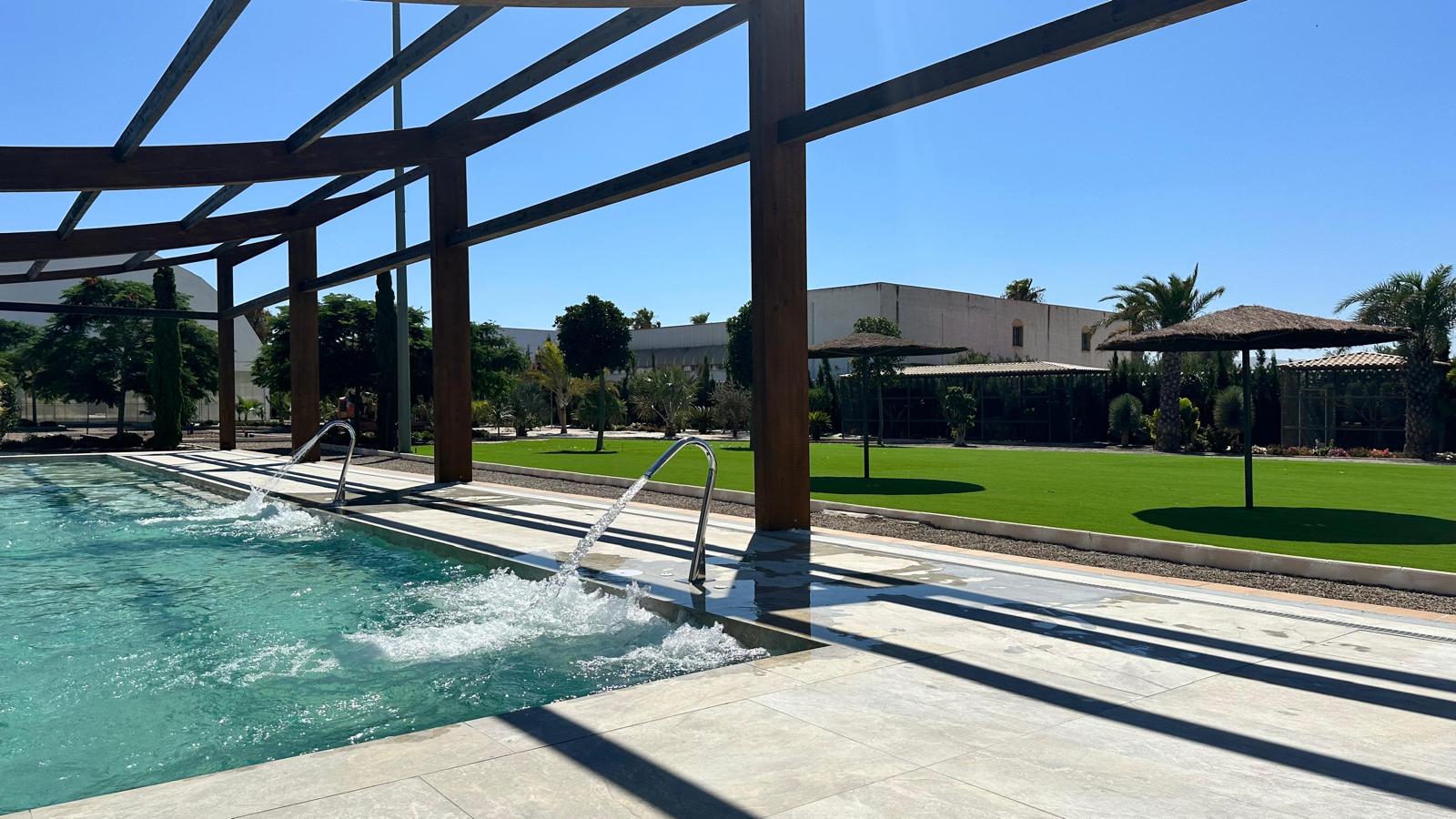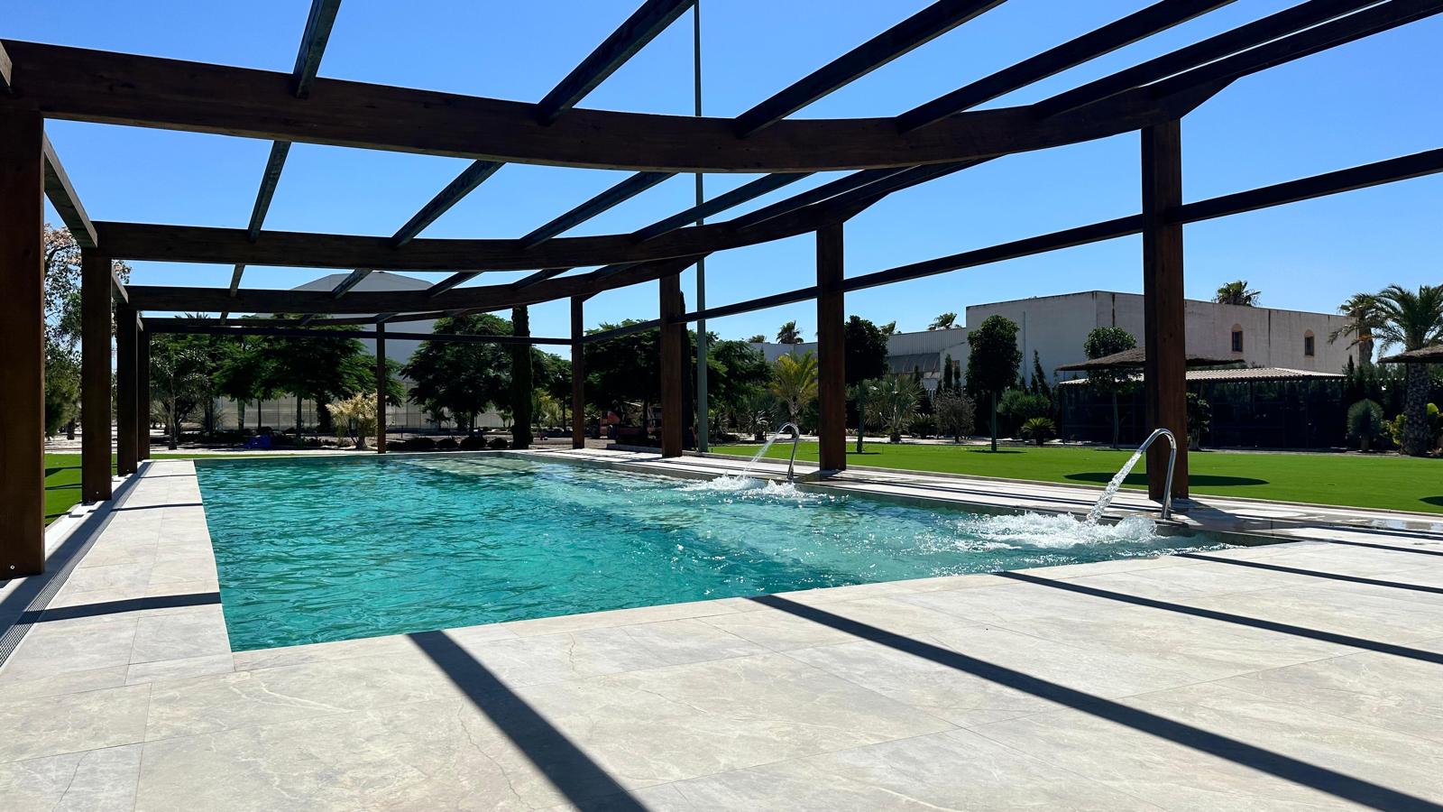 Como parte del programa de sombra y descanso, se ha ejecutado una pérgola de madera natural, preparada estructuralmente para ser cerrada y convertida en una piscina climatizada en fases posteriores del proyecto, lo que permitirá extender su uso durante todo el año.