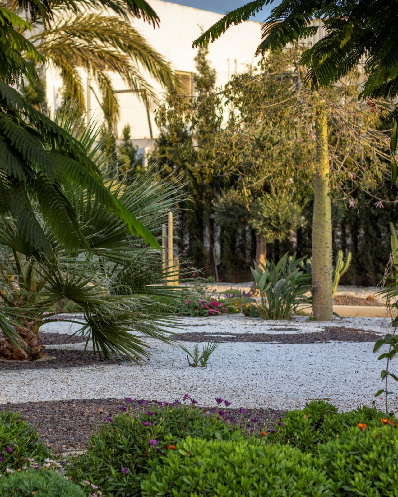 Los jardines que rodean la piscina combinan una rica variedad botánica adaptada al clima mediterráneo con un diseño funcional de itinerarios peatonales pavimentados, que conectan las distintas zonas de ocio, estancia y acceso. Todo el conjunto ha sido concebido para generar una experiencia sensorial completa, equilibrando estética, confort y funcionalidad en un entorno único.